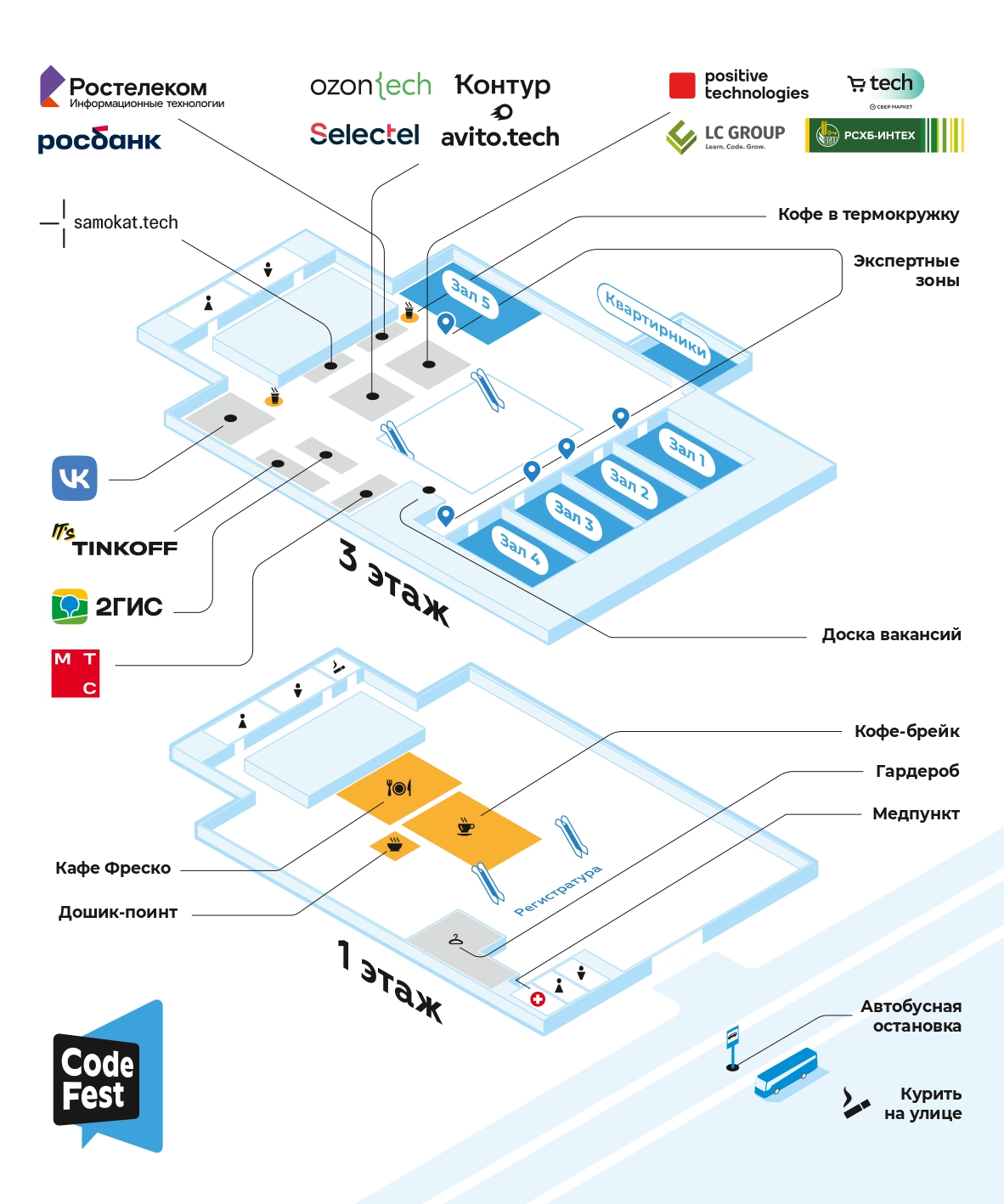 Онлайн есть платный, а есть бесплатный. В бесплатном онлайне доступен Live Channel и Квартирники. В платном — все залы всей программы и доступ к записям выступлений после CodeFest.
